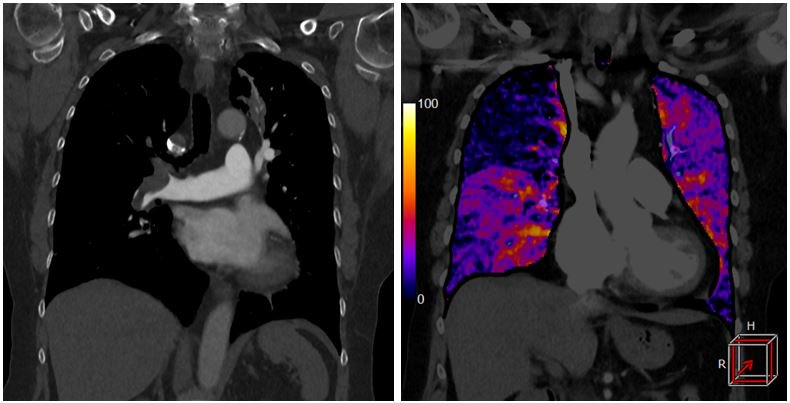 Дозволяє визначити розподіл накопичення йоду в паренхімі легенів для оцінки периферичного дефекту контрастування при хронічній ТЕЛА. Легенева КTA є широко розповсюдженим обстеженням для оцінки пацієнтів з підозрою на легеневу емболію. Проте, виявлення невеликої або субсегментарної емболії може бути ускладнене або неможливе. Субтракція дає можливість створити йодну карту паренхіми легень з високим співвідношенням контрасту до шуму. Використання кодування кольором дозволяє легко визначити області гіпоперфузії в легенях, підвищуючи реальну діагностичну цінність у хворих з прихованою емболією.