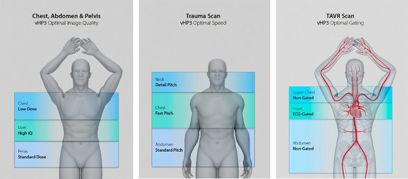 Можливість проведення дослідження з різними параметрами для різних анатомічних зон. Наприклад, при політравмі - сканування шиї з детальними параметрами, потім зі стандартними та синхронізацією з ЕКГ, і з низькодозовими абдомінальну область і таз. Дозволяє знизити дозу на пацієнта, прискорити сканування і заощадити контраст.