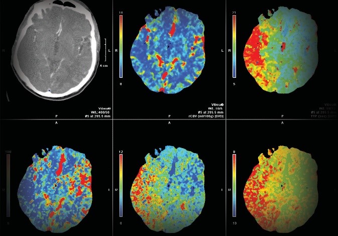 За допомогою динамічного сканування та спеціального програмного забезпечення, можна проводити оцінку перфузії головного мозку. Розрахунок карт перфузії для регіонарного мозкового кровотоку, регіонарного мозкового об'єму крові, середнього часу кровотоку, часу досягнення максимального значення і затримки перфузії, що допомагає лікарям визначити наявність гострих церебральних інфарктів в тканини мозку при гострому інсульті.