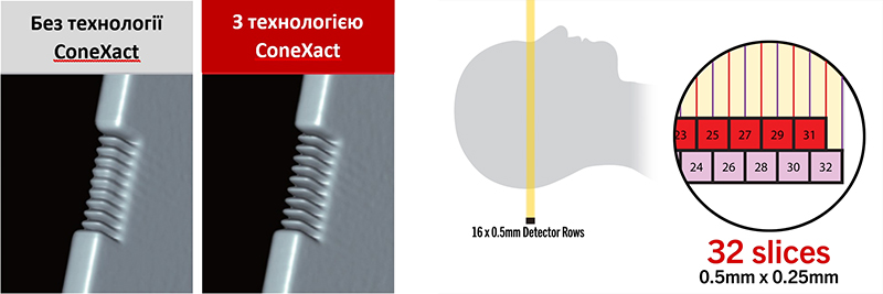 Унікальна технологія coneXact™ дозволяє подвоювати число зрізів даних з одного ряду детектора. Таким чином на базі 80-рядного детектора отримуються 160 зрізів. Це підвищує роздільну здатність без збільшення дози.