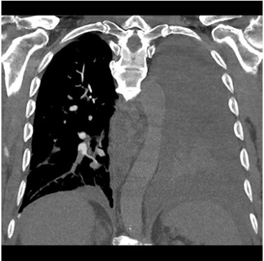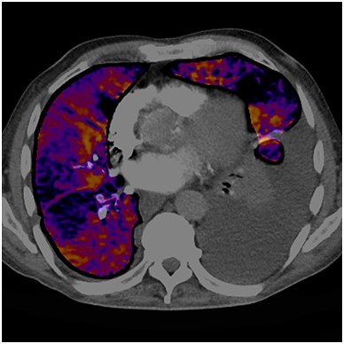 Дозволяє визначити розподіл накопичення йоду в паренхімі легенів для оцінки периферичного дефекту контрастування при хронічній ТЕЛА. Легенева КTA є широко розповсюдженим обстеженням для оцінки пацієнтів з підозрою на легеневу емболію. Проте, виявлення невеликої або субсегментарної емболії може бути ускладнене або неможливе. Субтракція дає можливість створити йодну карту паренхіми легень з високим співвідношенням контрасту до шуму. Використання кодування кольором дозволяє легко визначити області гіпоперфузії в легенях, підвищуючи реальну діагностичну цінність у хворих з прихованою емболією.