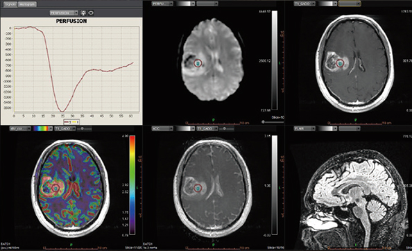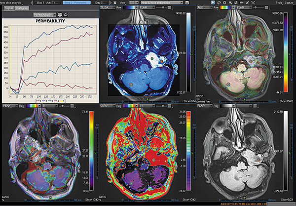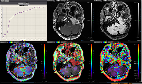 Додаток Brain Tumor пропонує автоматизовану покрокову обробку, включаючи кількісний мультипараметричний аналіз. Ця програма також включає оптимізований алгоритм корекції витоку контрастної речовини для підвищення точності оцінки DSC MР-перфузії.