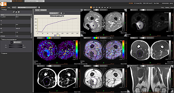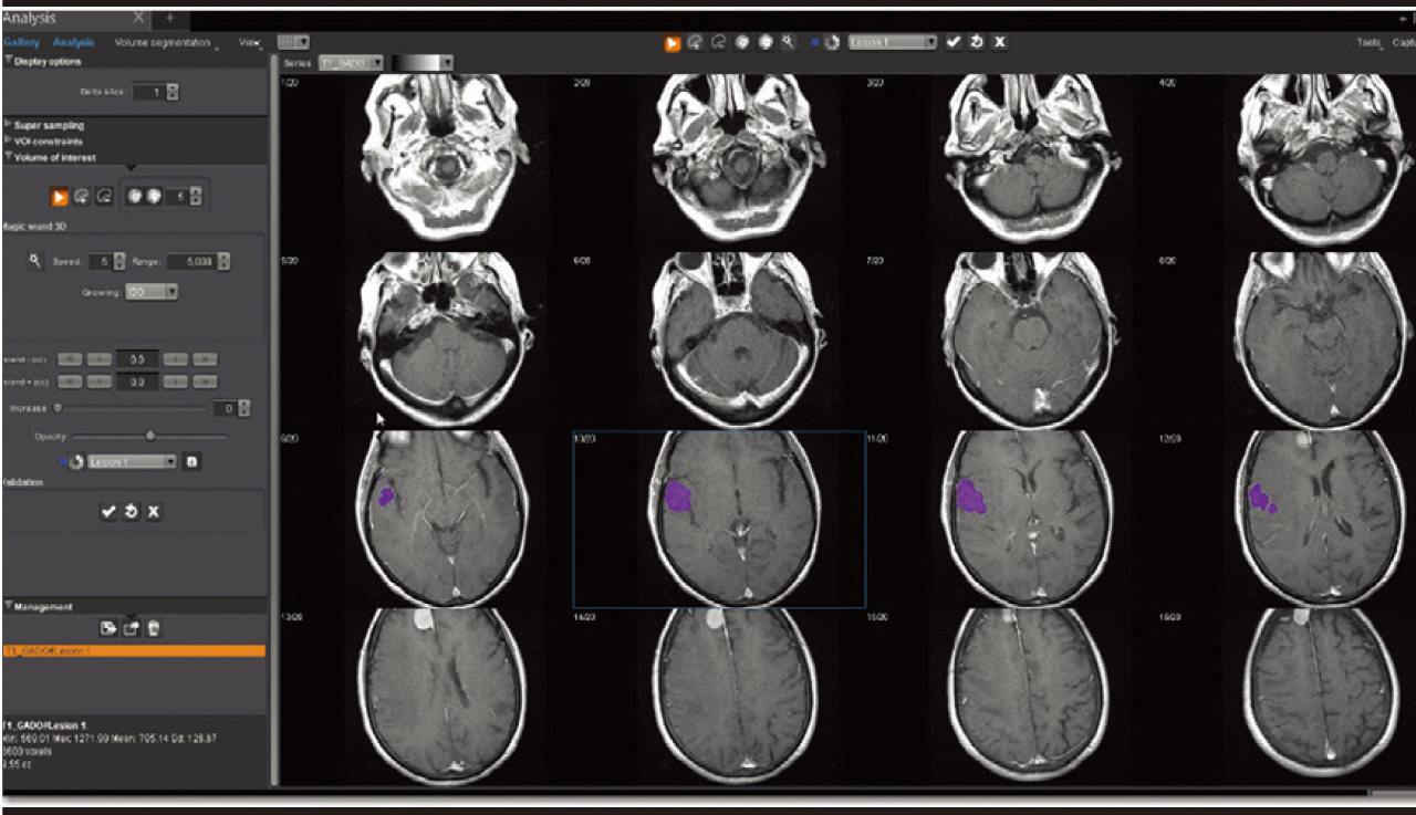 Додаток Аналіз візуалізує, сегментує, вимірює та оцінює широкий спектр наборів даних від звичайних серій до перфузійних та кінетичних серій разом із серіями DTI та DWI. Він забезпечує визначені користувачем накладання, включаючи візуалізацію органу/або патології, аналіз кінетики та кривих, аналіз кривих, статистику, співвідношення та гістограми, синтез декількох серій, напівавтоматичне сегментування об’єму, рендеринг об’єму та подальші динамічні спостереження.