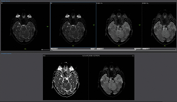 Додаток DWI обробляє ізотропні зображення з кожного окремого коефіцієнта дифузії. Він обчислює параметричні карти, такі як карти ADC та експоненціальні карти ADC.