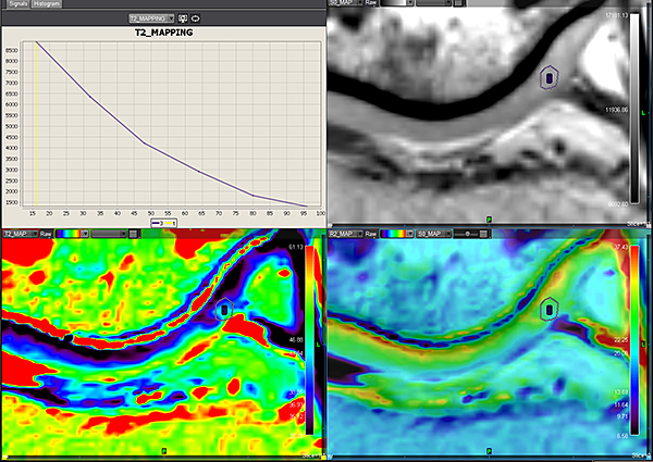 Плагін також дозволяє фахівцям вимірювати зміни хрящів у спортсменів, на яких часто впливає передчасне старіння та травми. Плагін релаксометрії надає T2_map, обчислену з T2-послідовностей (спінові ехо-послідовності з декількома ехо), пропонуючи оцінку T2.