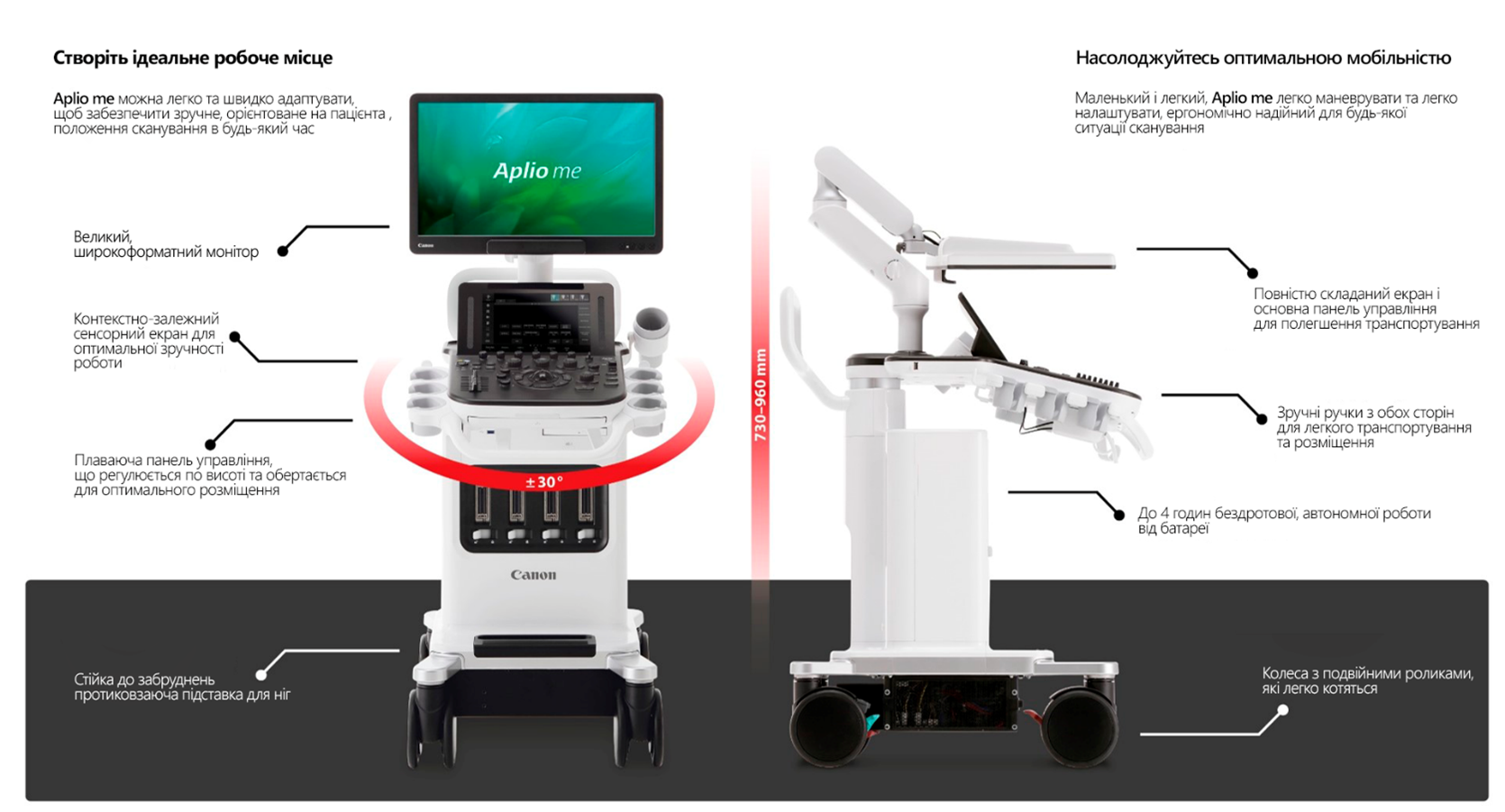 Aplio me — це гнучка, компактна та легка платформа Healthy Sonographer* з подовженим терміном роботи від батареї, яка дає змогу миттєво бути готовими до роботи будь-де та будь-коли.