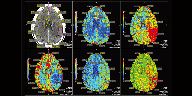 Пакет CT Brain Perfusion 2D дозволяє візуалізувати виражений кровотік, об'єм крові і середній час кровотоку (MTT), що допомагає лікарям визначити наявність гострих церебральних інфарктів тканини мозку, ураженої при гострому інсульті.